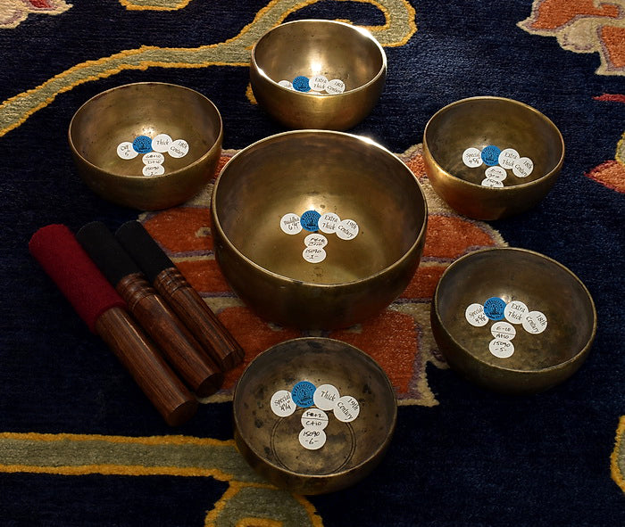 These Master-qualityTM¨ singing bowls are among the finest caliber of singing bowls available in the world. Master-qualityTM¨ means that these bowls have passed stringent tests for authentic antiquity, harmonic balance of sound, ease of playing, volume, and long-lasting sustain. Singing bowls are also known as chakra bowls, sound bowls, Buddhist bowls, and meditation bowls.