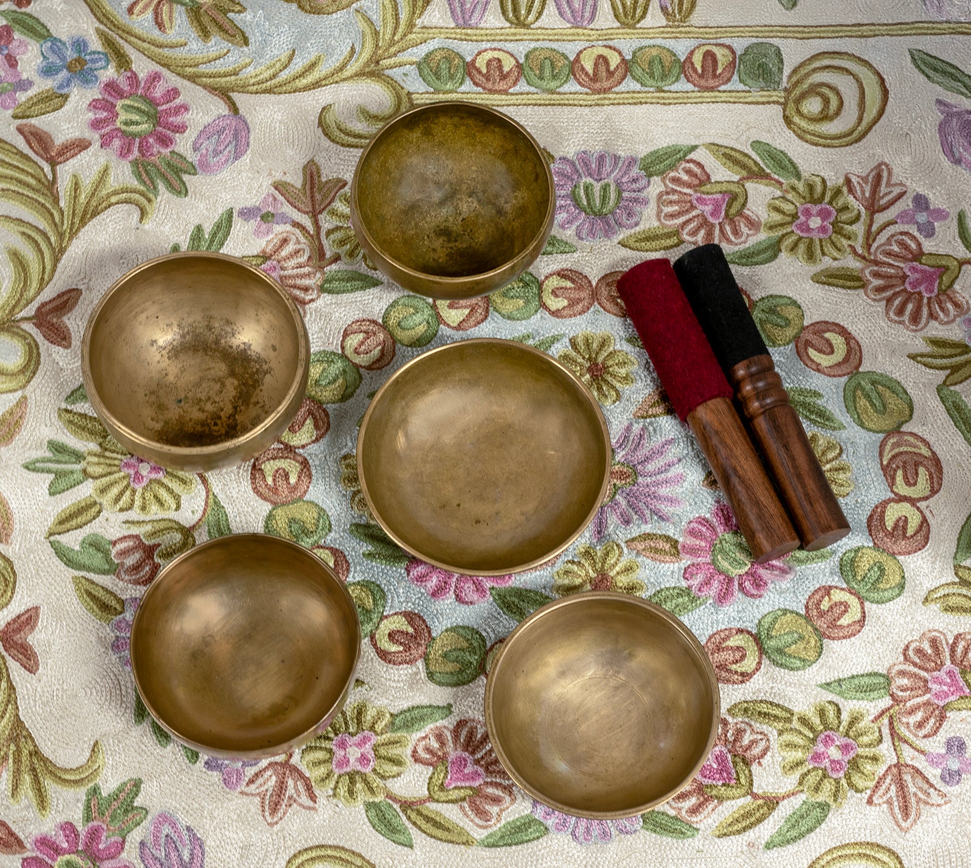 Carefully curated, 5-piece, antique cup singing bowl set, with its soothing F# major pentatonic tones, is designed to help reduce anxiety and encourage a deeper sense of emotional harmony.