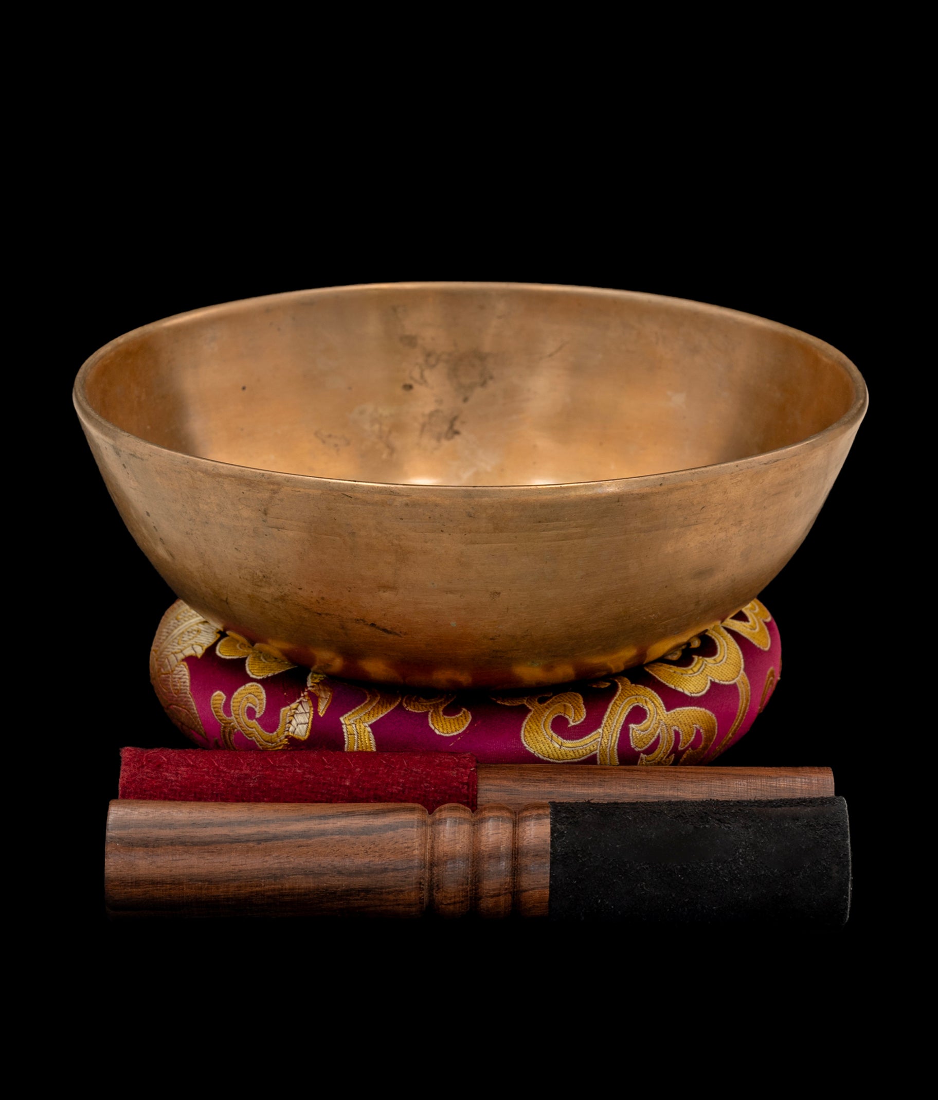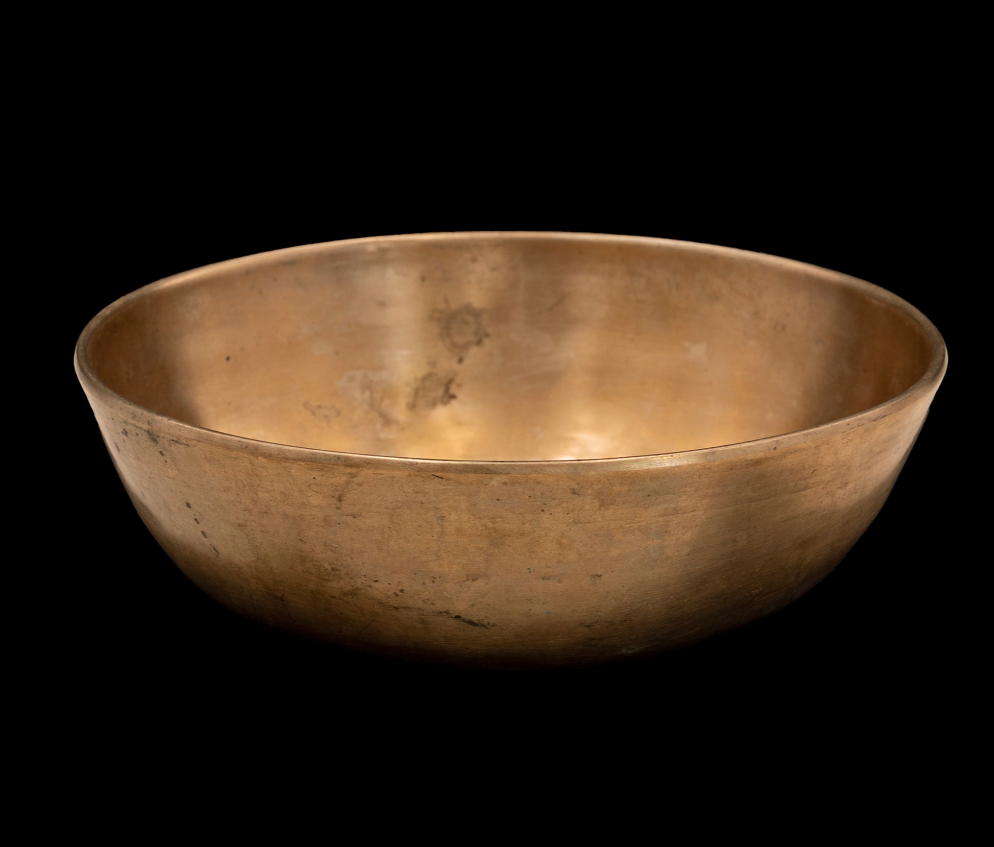 Called Manipuri throughout the Himalayas. Said to come from the Manipur region (in the eastern Himalayas near Nagaland), but this shape is also typically Tibetan as well. Their walls are lower in ratio to the diameter, with a gradually sloping base. This type of singing bowl is thick to extra-thick, often with a triangulated lip, and sometimes decorated with tooled or engraved sacred geometric patterns such as the circle and dot motif. Typically they range from approximately 4 inches up to a little over 10 inches, although they are now rare in these larger sizes. Tones, likewise, range from the second to the fifth octaves.