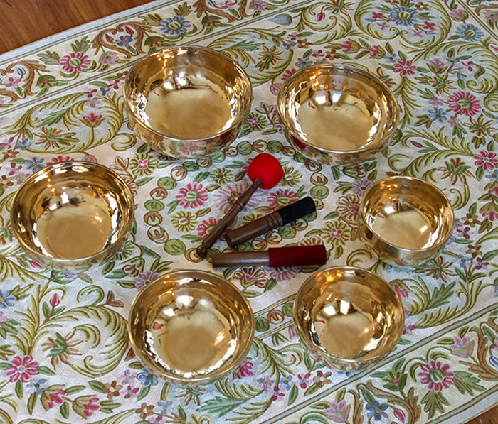 This set includes all new Himalayan singing bowls, hand-made in Nepal, with a polished finish. The 6-bowl set includes a certificate of authenticity with bowl listing on the reverse side, a wool-padded gong mallet, and both wool- and leather-padded mallets.